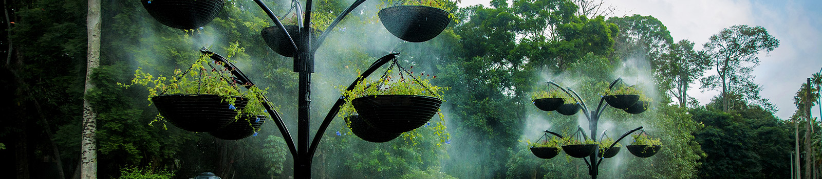 - The upper flower garden also displays annual flowers and it includes a herbaceous and a mini rose collection.A Montezume pine (Pinus montezumae) from Mexico and Hoope pine (Araucaria cunninghamii) from New South Wales lie on either sides of the flower garden.A row of Jacaranda trees, (Jacaranda ovalifolia) with mauve flowers, is seen below. A giant Monterey cypress tree and Japanese cedar trees, (Cryptomeria japonica) grow around the flower garden. A dark green and deeply cut-leave creeper, the Dada Kehel (Rhaphidophora decursiva) is visible growing on a wanasapu tree, (Michelia nilagirica).